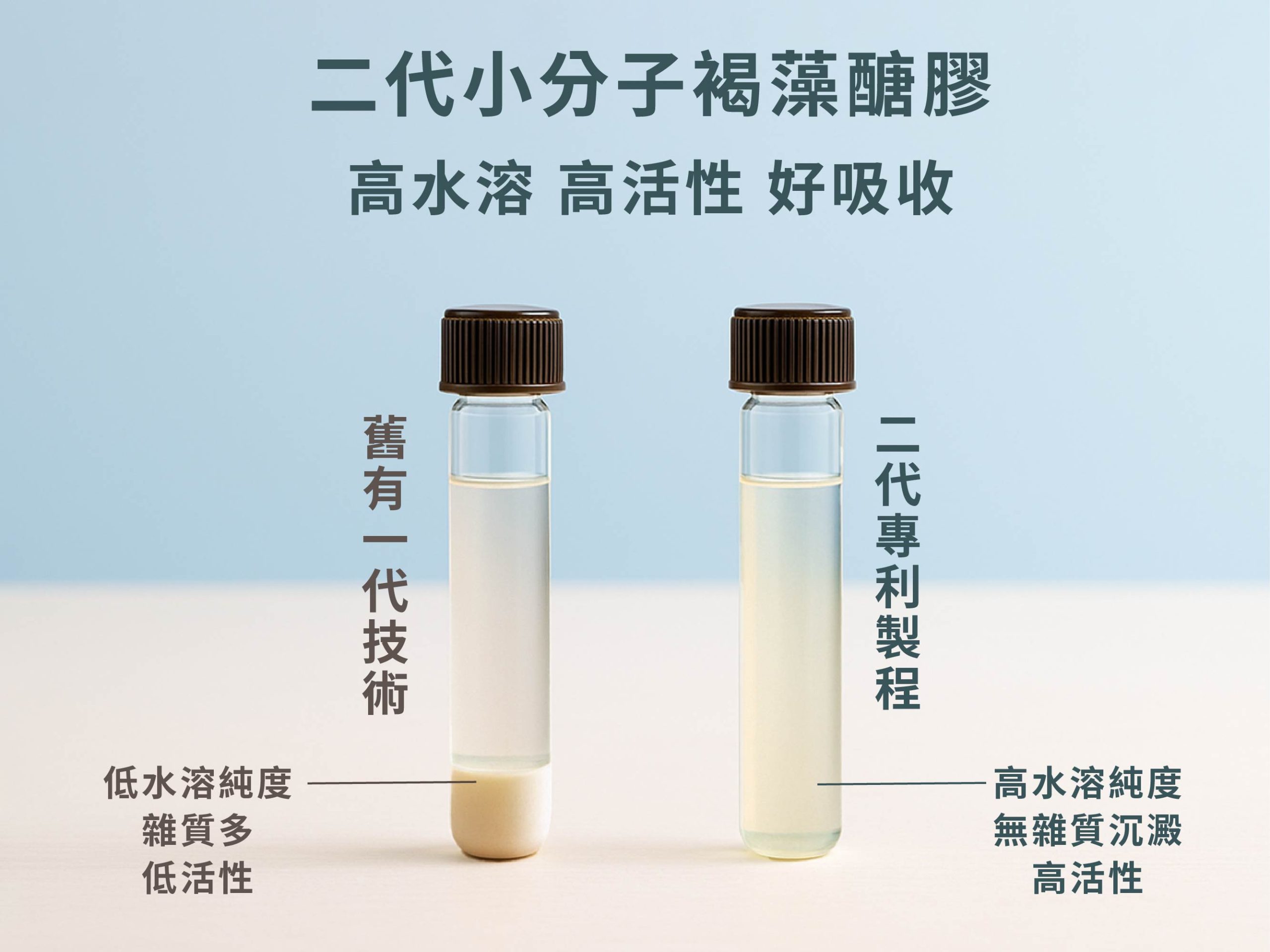 褐藻醣膠經由多孔高滲透與超壓過濾技術精製,透過先進過濾系統對生物水解後的原料進行深度純化與濃縮,有效去除雜質與非活性成分,可顯著維持褐藻醣膠的純度與生物活性表現。依據實際食用量計算與比較結果顯示,與僅採用生物水解製程的產品相比,在相同活性條件下,所需補充量可降低至約一半,有助於維持使用效率與體感表現。