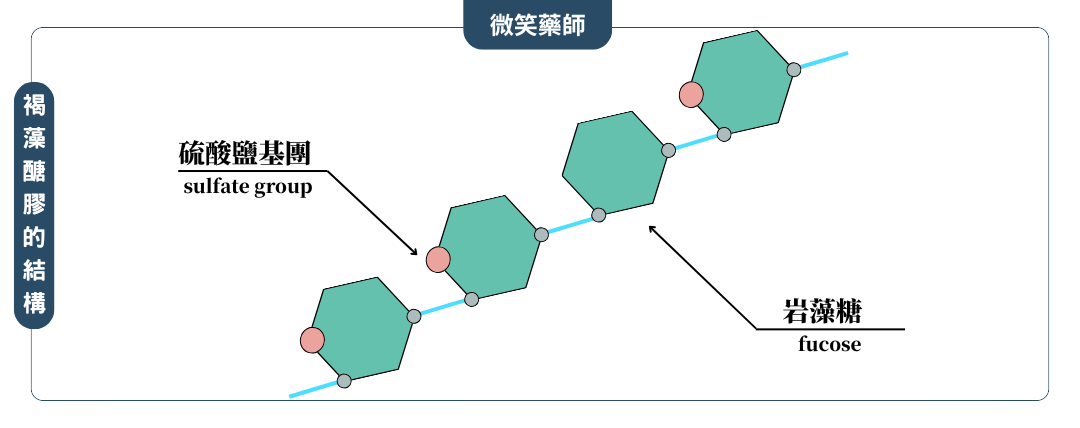 褐藻醣膠的結構主要由L-岩藻糖(fucose)所構成的多醣體,並帶有豐富的硫酸酯基團(sulfate ester group),其結構極性及帶電性,賦予褐藻醣膠高度的水溶性和生物活性,並具有多樣化的保健功效。其主鏈由 L-岩藻糖鏈接,並結合其他單醣(如半乳糖、甘露糖、木糖)與醣醛酸,呈現複雜的非單一標準分子結構。