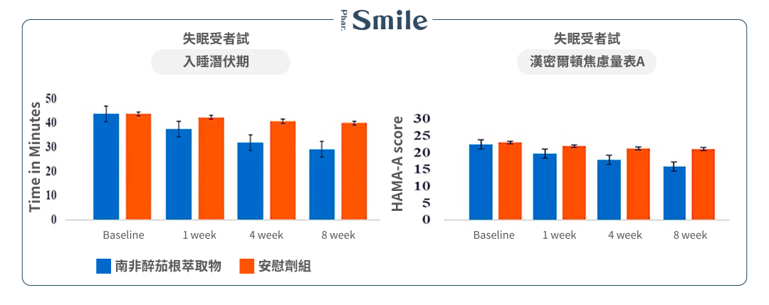 2021年進行一項隨機雙盲平行組分層安慰劑對照試驗,納入40位健康受試者與40位失眠受試者(18-50歲),並將他們隨機分成南非醉茄根萃取物組與安慰劑組,每組各20人,介入期持續8週。研究透過睡眠活動記錄器監測睡眠狀況,搭配匹茲堡睡眠品質指數、漢密爾頓焦慮量表A問卷、起床警覺性評估及睡眠品質問卷,全面評估600毫克南非醉茄根萃取物(早晚各300毫克)對健康及失眠受試者睡眠狀況的藥理效應【13】。