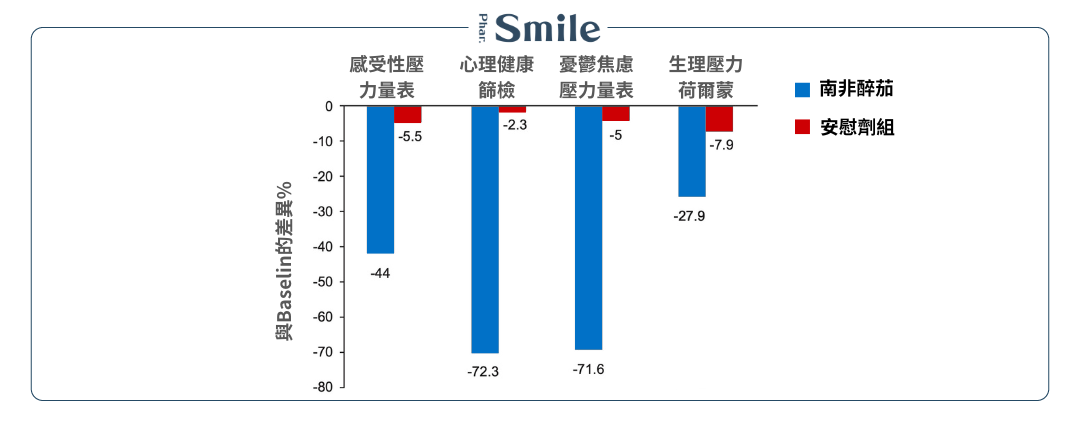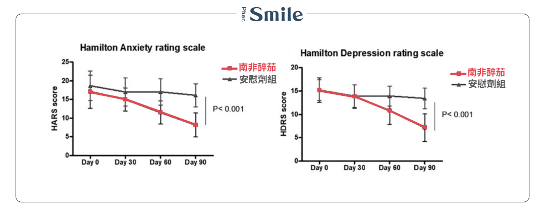 2024年隨機雙盲安慰劑對照試驗,評估南非醉茄用於輕至中度憂鬱和焦慮症患者的效果。試驗納入70位受試者,隨機分成南非醉茄組(每日補充500毫克標準化南非醉茄,含2.5%醉茄內酯及5毫克95%胡椒鹼)或安慰劑組,持續介入90天。研究透過漢密爾頓憂鬱量表(HDRS)、漢密爾頓焦慮量表(HARS)、格羅寧根睡眠品質量表(GSQS)和生活品質(QOL)的平均變化,評估南非醉茄的效益。研究結果顯示,食用南非醉茄組各項量表評分顯著提高,改善幅度顯著優於安慰劑組。另外,南非醉茄組血液血清素濃度升高,但安慰劑組的血清素濃度降低,差異具有統計學意義(p < 0.001)。結論:南非醉茄可能有助於透過提高血清血清素水平來改善憂鬱和焦慮【15】。2025年前瞻性隨機雙盲安慰劑對照試驗,評估南非醉茄萃取物(1.5% 的總醉茄內酯)對於患有非慢性輕度至中度壓力的受試者,其壓力、焦慮、情緒和睡眠品質的安全性和有效性。研究納入90名受試者,分別每日使用125毫克南非醉茄萃取物或安慰劑,持續84天。研究結果發現使用南非醉茄組別主觀和客觀壓力指標均顯著降低,情緒、睡眠品質(匹茲堡睡眠品質指數)和偶爾出現的焦慮症狀都有改善。南非醉茄萃取物耐受性佳,未出現任何相關不良事件【16】。