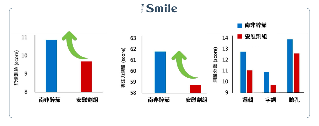 2017年前瞻性隨機雙盲安慰劑對照研究,收錄50位受試者(35歲以上早期失智症或輕度認知障礙),受試者分別接受南非醉茄根萃取物(每日兩次,每次300毫克)或安慰劑治療,療程八週。研究結果顯示,南非醉茄可能有效增強輕度認知障礙患者的即時記憶和一般記憶,並改善其執行功能、注意力和資訊處理速度【17】。