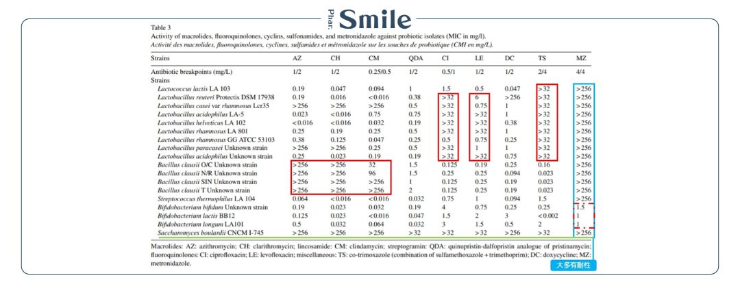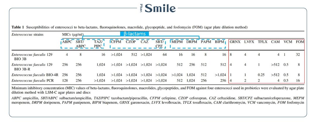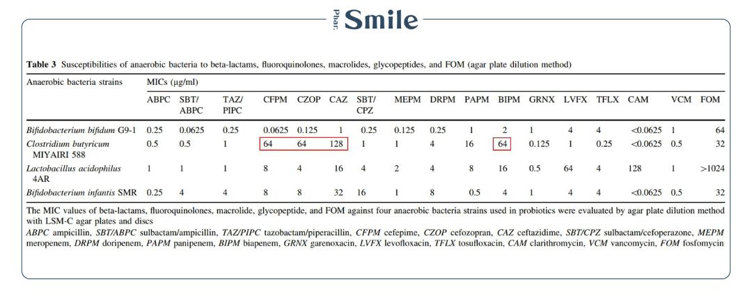 Clostridium butyricam MIYAIRI 588(BM菌)則對cepha類抗生素有點耐受性,但卻不敵常見的ampicillin抗生素。而B. bifidum G9-1、L. acidophilus 4AR及B. infantis SMR對大部分的抗生素都不具耐受性。